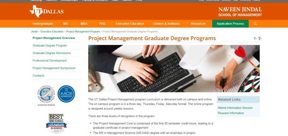 The program curriculum of UT Dallas MS in Management Science with an emphasis in Project Management combines both technical aspects and critical human skills to provide comprehensive training in project and program management. Admission to the program is highly selective to ensure that high standards are maintained in a cohort class. Candidates are evaluated on criteria that include prior academic and professional accomplishments, serious commitment and leadership skills. To earn the degree with an emphasis in project management, students are required to complete a Project Management Core comprised of 20 semester credit hours and an additional 19 semester credit hours that includes business core courses and an international study trip. The program is delivered in a three day format; Thursday, Friday, and Saturday.