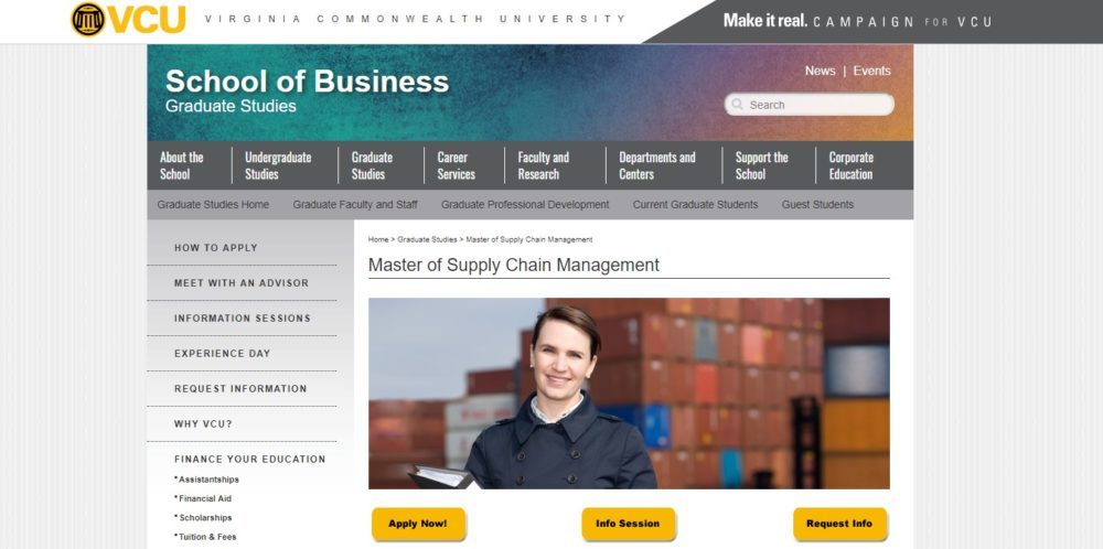 Master of Science in Supply Chain Management from Virginia Commonwealth University is a program aimed at professionals who aim at establishing or advancing their careers in supply chain management. The rigorous curriculum ensures students learn skills and techniques necessary to ensure their success in supply chain management field.