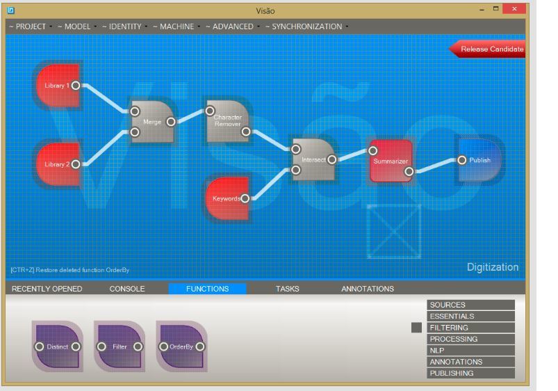 Visão is powerful desktop software that enables users to effortlessly process and analyze large text data. Visão allows users to design fully-customizable flows, to manipulate and transform their data into the required shape or to carry out a statistical analysis. Visão is mainly focused on computer-aided text analysis; therefore it supports various encodings, dictionary-building, regex patterns, and many other important features. Visão can be used for custom patterns quantification. Users can utilize regular expressions or a dictionary to specify the domain to be quantified. Users can select the input files and functions to pre-process the input, choose methods to compare tokens, and select how to format the final output. Users do not have to know a sophisticated language; they can simply use the graphic representations to visualize the whole process fast and easily. When users click “Run”, Visão does the rest, no matter how long it takes. Visão supports plain text files and CSV (comma separated values) files, and can import text data from a single file or process a whole directory.