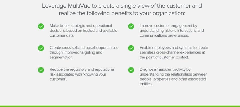MultiVue MDM solution enables organizations to realize the benefits associated with a data-driven business by creating a single and complete view of the customer across previously siloed and disparate data sources.