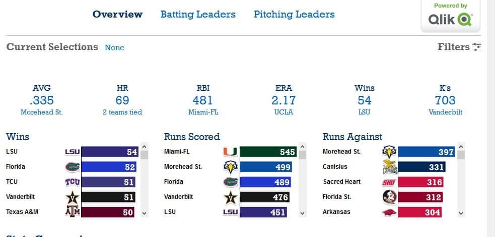 Visual analytics experiences available for NCAA Men’s College World Series: Qlik will bring vast amounts of official sports statistical information directly to passionate fans’ fingertips for the NCAA Men’s College World Series via NCAA.com. From the first batter to the final out, Qlik will collaborate with Turner Sports to bring the game to life for fans whether they’re sitting in the stands, watching it on television in their living rooms, or following the action with a mobile device. The Qlik-powered app - now live on NCAA.com brings interactive statistics to fans following this year’s College World Series. Users can ask a seemingly limitless number of questions and impress fellow fans with answers to questions such as which player has the most runs batted in (RBI)?, Who are the pitchers with the most wins and the most strikeouts?, How many times has the stolen base leader been caught stealing?, Which sophomore player has the most hits and the most home runs? And Which catcher has the highest batting average?