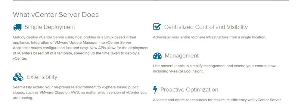 vCenter Server provides centralized management of virtualized hosts and virtual machines from a single console. It gives administrators deep visibility into the configuration of the critical components of a virtual infrastructure—all from one place. With vCenter Server, virtual environments are easier to manage: a single administrator can manage hundreds of workloads, more than doubling typical productivity when managing physical infrastructure. With automated proactive management, vCenter Server allows service levels to be met by dynamically provisioning new services, balancing resources and automating high availability.