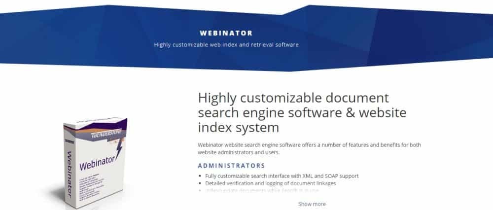 The Webinator Web Index & Retrieval System is a highly customizable website search engine software package built on the Texis platform and coded in Vortex (Texis Web Script) that allows for the easy creation and deployment of a high quality search interface to collections of web documents.