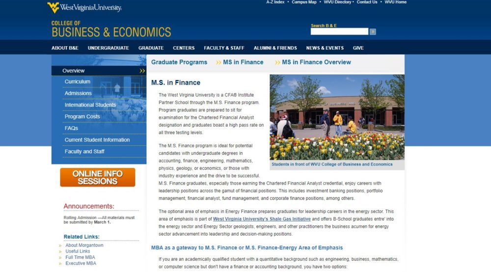 West Virginia University, MS in Finance