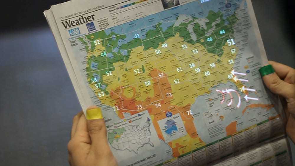 The software program processes the video stream data captured by the camera and tracks the locations of the colored markers (visual tracking fiducials) at the tips of the user’s fingers. The movements and arrangements of these fiducials are interpreted into gestures that act as interaction instructions for the projected application interfaces. SixthSense supports multi-touch and multi-user interaction.