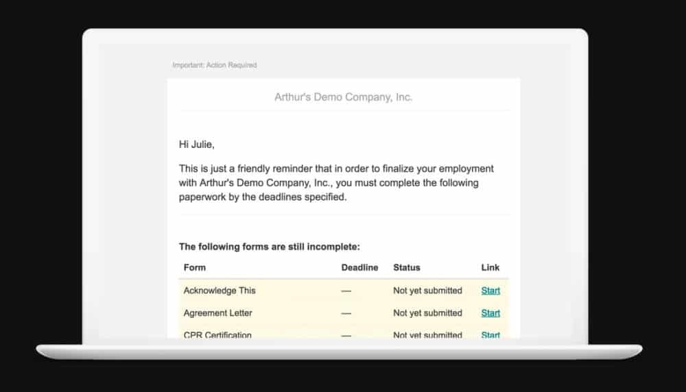 WorkBright will automatically send out reminder emails to employees who have not completed their forms with increasing urgency and frequency as their first day approaches. Emails are customized to the employee to list forms pending and with links directly to their account to complete.